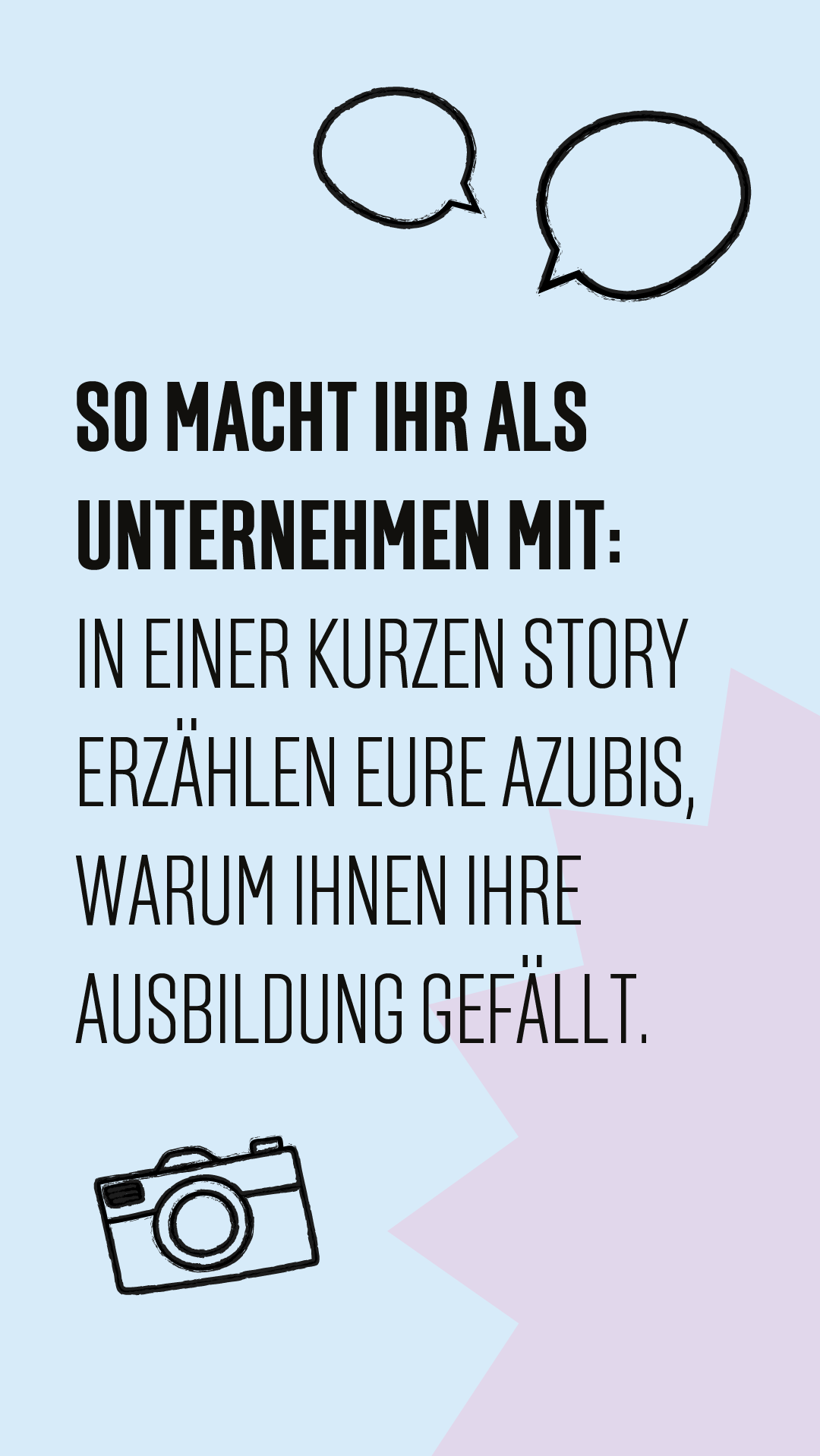 - In kurzen Instagram-Stories ihren bevorzugten Ausbildungsbereich vorstellen und in wenigen Sätzen erläutern, was ihnen daran besondere Freude bereitet.