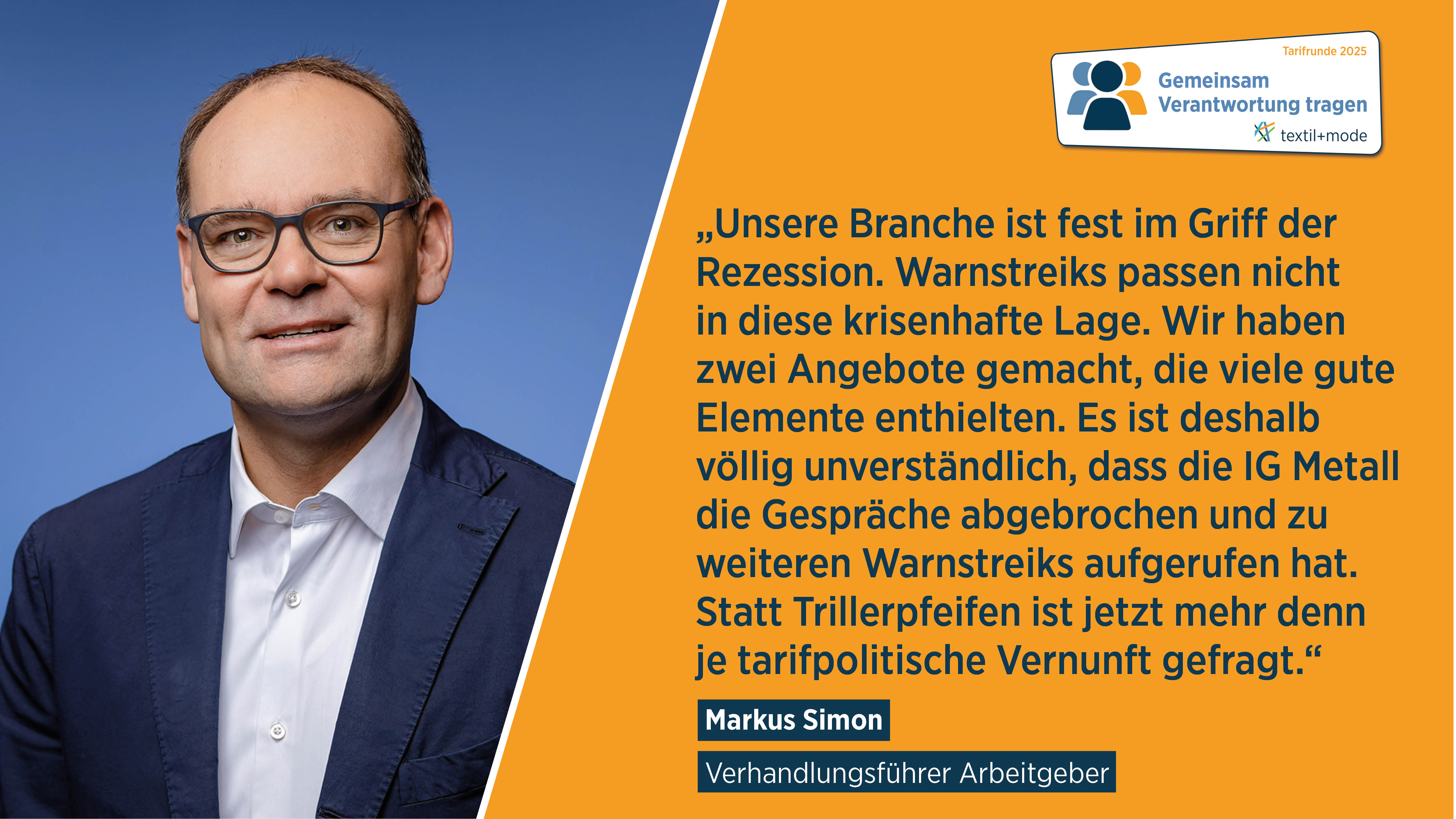 Neben dem Aushang bieten wir Ihnen und Ihren Mitgliedsunternehmen auch ein SharePic für Ihre Social-Media-Kommunikation sowie ein Wortlaut-Interview mit Verhandlungsführer Markus Simon an. Dieses Interview und weitere Informationen finden Sie auch unter: Tarifrunde 2025 - Textil+Mode. Dort besteht auch die Möglichkeit, das Tariflogo sowie Fotos herunterzuladen.